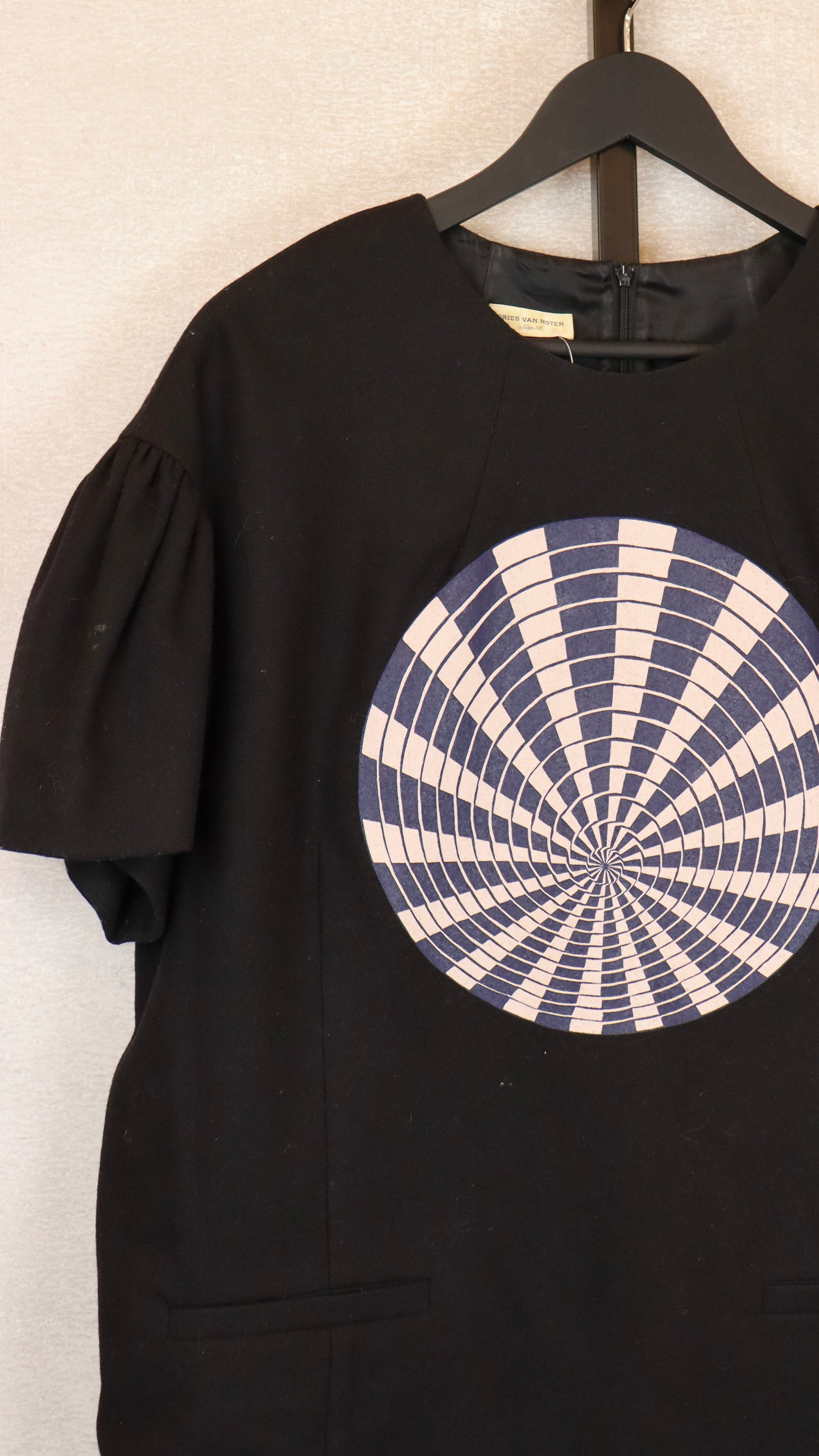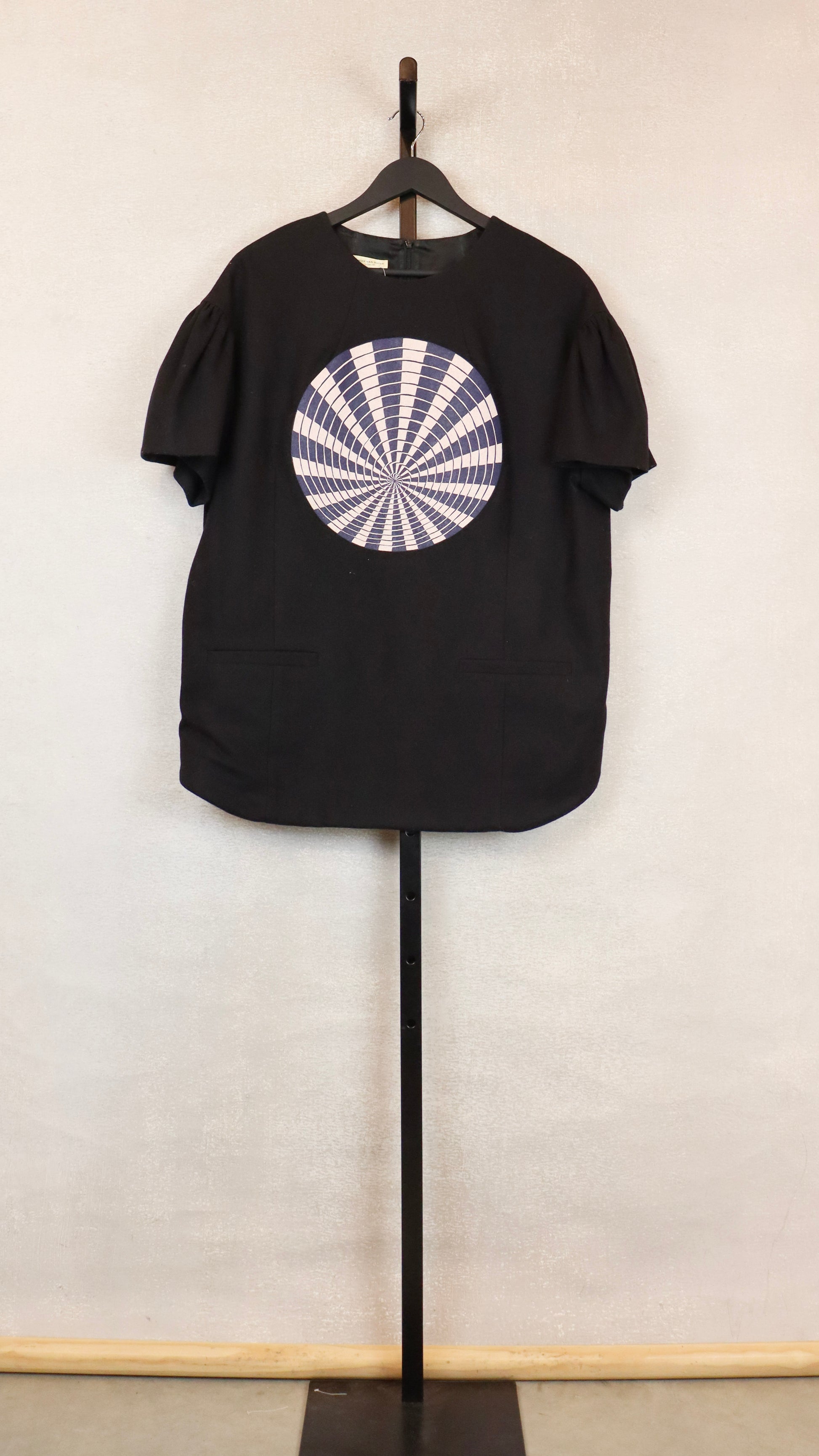 Black Wool Circle Print Tunic w/ Puff Sleeves + Front Pockets
